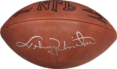 Johnny Unitas who played from the 1950s through the 1970s. He spent the majority of his career playing for the Baltimore Colts. He was a record-setting quarterback and the National Football League's most valuable player in 1959 1964 and 1967. For 52 years he held the record for most consecutive games with a touchdown pass (which he set between 19561960) until New Orleans Saints quarterback Drew Brees broke his long standing record on October 7 2012. Unitas was the prototype of the modern era marquee quarterback with a strong passing game media fanfare and widespread popularity. He has been consistently listed as one of the greatest NFL players of all time. Johnny Unitas has hand signed this Official NFL Tagliabue Football. Certificate of Authenticity from Athlon Sports Collectibles.
