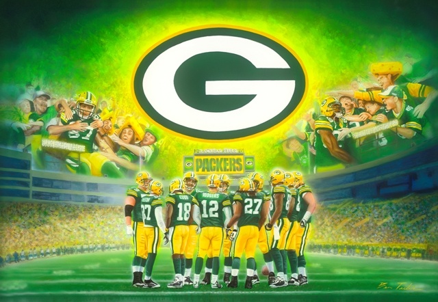 This NFL licensed exciting painting of the Green Bay Packers complete with Cheese Heads jumping out of their seats Packer players in the stands and the Packers in a huddle in the middle of the field says it all! Packer Backers are all crazy but so would you be if you were one of the owners of the team a legacy of a great franchise prevails. Giclee prints are museum quality pieces printed using archival ink on archival canvas with the industries most advanced technology. Prints through this process result canvases that are as detailed and richly colored as an original painting. Fade resistant archival inks and fine art grade printing material guarantee a beautifully crafted piece that will endure.