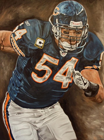 This NFL licensed painting captures the relentless attitude of Chicago Bears linebacker Brian Urlacher. Known for his never quit attitude Brian Urlacher would chase down offensive players anywhere on the field. He is the most relentless player in the game today. Giclee prints are museum quality pieces printed using archival ink on archival canvas with the industries most advanced technology. Prints through this process result canvases that are as detailed and richly colored as an original painting. Fade resistant archival inks and fine art grade printing material guarantee a beautifully crafted piece that will endure.