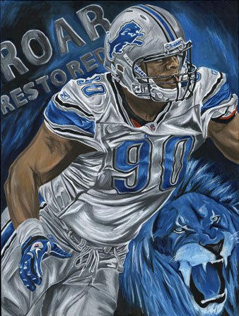This NFL licensed painting showcases Detroit Lions defensive tackle Ndamukong Suh. Suh terrorizes offenses and has restored the roar once againfor the Detroit Lions. Giclee prints are museum quality pieces printed using archival ink on archival canvas with the industries most advanced technology. Prints through this process result canvases that are as detailed and richly colored as an original painting. Fade resistant archival inks and fine art grade printing material guarantee a beautifully crafted piece that will endure.