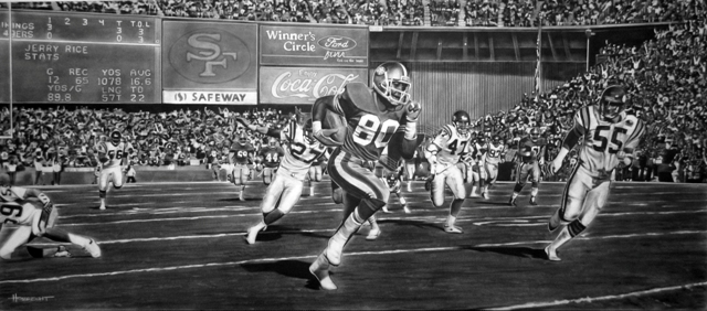 In this large stunning panoramic NFL Licensed painting Hall of Fame wide receiver Jerry Rice's speed and grace are beautifully amd timelessly portrayed. As Rice grabs a Joe Montana pass and races down the sideline for another San Franciaco 49ers Touchdown he is untouchable-just like most of his career receiving records. Giclee prints are museum quality pieces printed using archival ink on archival canvas with the industries most advanced technology. Prints through this process result canvases that are as detailed and richly colored as an original painting. Fade resistant archival inks and fine art grade printing material guarantee a beautifully crafted piece that will endure.