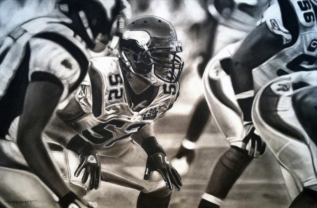 One of the most exciting moments in a football game is 3rd and inches or 4th and goal from the 1 yard line when the offense and defense square off for battle in the trenches. Shown in this NFL Licensed Painting is the tense moment immediately before the snap on a short yardage play. The Minnesota Vikings defense loads the box anticipating the run and daring the offense to throw the ball. Giclee prints are museum quality pieces printed using archival ink on archival canvas with the industries most advanced technology. Prints through this process result canvases that are as detailed and richly colored as an original painting. Fade resistant archival inks and fine art grade printing material guarantee a beautifully crafted piece that will endure.