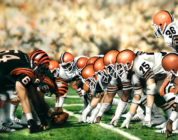 Ohio is a State that is crazy for football. The Pro Football Hall of Fame is built on the ground right next to the first pro football stadium where the Canton Bulldogs played .The Cincinnati Bengals and the Cleveland Browns are in constant competition with one another and only are sen together when they play a game. Their rivalry is legendary. It is NFL Licensed Painting. Giclee prints are museum quality pieces printed using archival ink on archival canvas with the industries most advanced technology. Prints through this process result canvases that are as detailed and richly colored as an original painting. Fade resistant archival inks and fine art grade printing material guarantee a beautifully crafted piece that will endure.