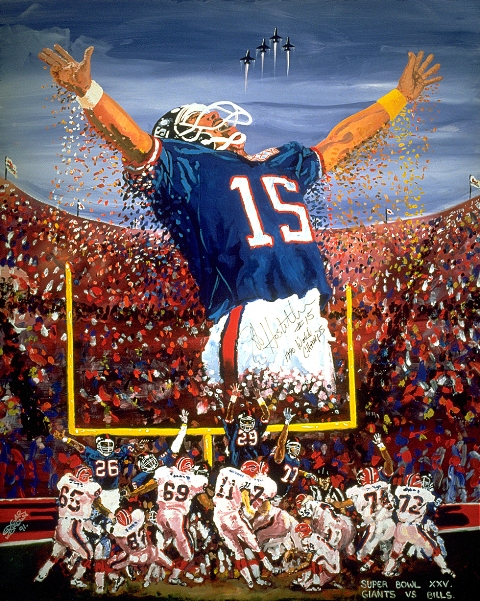 In this NFL Licensed Painting Super Bowl XXV the NFC champion NY Giants won their second Super Bowl against the Buffalo Bills with a score of 20-19. This battle was fought on the field while our soldiers were fighting a real battle in Iraq. The stadium was under high alert with everything being checked and jets flying overhead but fans were there to show their love of the game. Giclee prints are museum quality pieces printed using archival ink on archival canvas with the industries most advanced technology. Prints through this process result canvases that are as detailed and richly colored as an original painting. Fade resistant archival inks and fine art grade printing material guarantee a beautifully crafted piece that will endure.