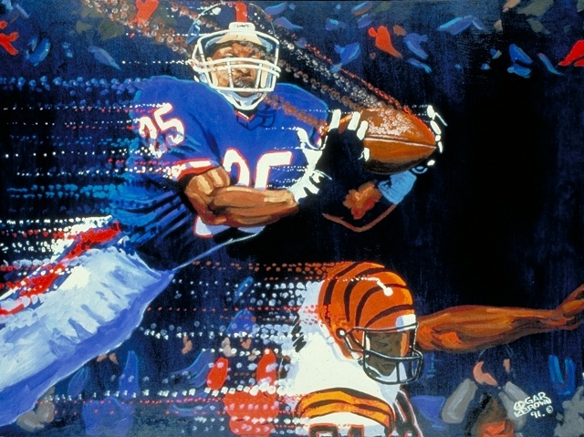 This NFL licensed painting captures New Youk's Big Blue Wrecking Crew's defensive back making an interception against a Bengals wide receiver. Giclee prints are museum quality pieces printed using archival ink on archival canvas with the industries most advanced technology. Prints through this process result canvases that are as detailed and richly colored as an original painting. Fade resistant archival inks and fine art grade printing material guarantee a beautifully crafted piece that will endure.