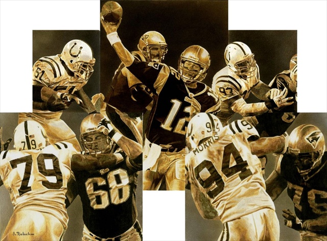 Tom Brady stands in the chaos of a pocket against the rush of 200-300 lb men doing their best to knock his head off. This NFL Licensed painting is actually four individual canvases placed on top of one another in a three-dimensional way that gives it a unique perspective and allows the viewers to get a sense of what Brady must feel as he attempts to release the ball and escape the rush of the oncoming defensive force. Giclee prints are museum quality pieces printed using archival ink on archival canvas with the industries most advanced technology. Prints through this process result canvases that are as detailed and richly colored as an original painting. Fade resistant archival inks and fine art grade printing material guarantee a beautifully crafted piece that will endure.