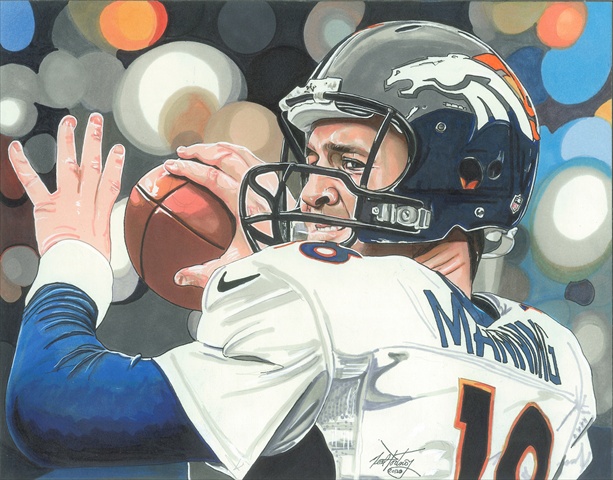 In this NFL Licensed Painting With Manning throwing the football Mile High has less to do with the nickname of the City of Denver and more to do with the strength and accuracy of that arm! Giclee prints are museum quality pieces printed using archival ink on archival canvas with the industries most advanced technology. Prints through this process result canvases that are as detailed and richly colored as an original painting. Fade resistant archival inks and fine art grade printing material guarantee a beautifully crafted piece that will endure.