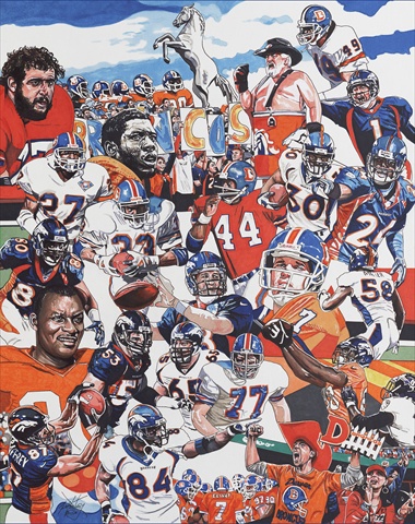 In this NFL Licensed painting The artist's rendition of the Denver Broncos featuring twenty different players is an amazing depiction of the spirit of the NFL and the City in which this team resides. Giclee prints are museum quality pieces printed using archival ink on archival canvas with the industries most advanced technology. Prints through this process result canvases that are as detailed and richly colored as an original painting. Fade resistant archival inks and fine art grade printing material guarantee a beautifully crafted piece that will endure.