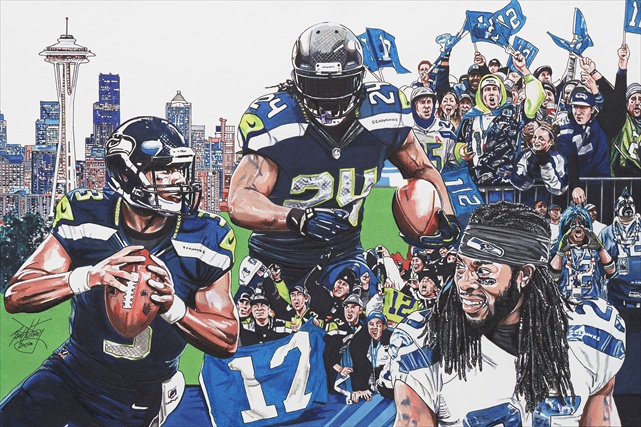 Entitled The 12th Man this intricate NFL Licensed painting of the Seattle Seahawks their famous Needle landmark and their fans is a gorgeous and incredible rendition of just what a football team can mean to its hometown. Giclee prints are museum quality pieces printed using archival ink on archival canvas with the industries most advanced technology. Prints through this process result canvases that are as detailed and richly colored as an original painting. Fade resistant archival inks and fine art grade printing material guarantee a beautifully crafted piece that will endure.