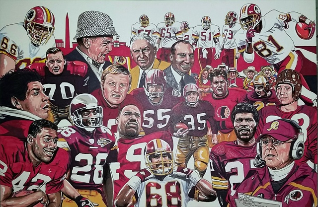 The Washington Redskins have had many championship years and many Hall of Fame members who played for them. In this NFL Licensed painting are Charlie Taylor Sam Huff Sonny Jurgenson Sammy Baugh Bill Dudley Bobby Mitchell Darryl Green George Preston Marshall John Riggens Art Monk and head coach Joe Gibbs. It is a true walk down memory way for Redskins fans of all generations to enjoy. Giclee prints are museum quality pieces printed using archival ink on archival canvas with the industries most advanced technology. Prints through this process result canvases that are as detailed and richly colored as an original painting. Fade resistant archival inks and fine art grade printing material guarantee a beautifully crafted piece that will endure.
