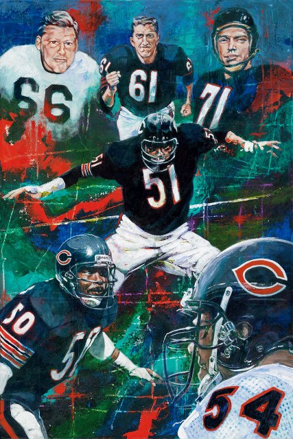 One of the greatest linebackers in the Chicago Bears history and in the middle is perhaps the greatest linebacker ever to play the game Dick Buthus #51. This NFL Licensed painting is signed by Dick Butkus Mike Singletary and Brian Urlacher. Also included in the painting are Bulldog Turner Bill George and George Connor Giclee prints are museum quality pieces printed using archival ink on archival canvas with the industries most advanced technology. Prints through this process result canvases that are as detailed and richly colored as an original painting. Fade resistant archival inks and fine art grade printing material guarantee a beautifully crafted piece that will endure.