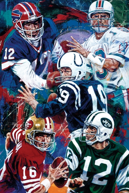 This NFL licensed painting depicts all of the great quarterbacks who came from Pennsylvania including Johnny Unitas Joe Namath Jim Kelly Joe Montana and Dan Marino. Although all of them came from Pennsylvania none played for a Pennsylvania NFL team. It is usually a toss up for football fans whether Johnny Unitas or Joe Montana was the greatest quarterback ever. Giclee prints are museum quality pieces printed using archival ink on archival canvas with the industries most advanced technology. Prints through this process result canvases that are as detailed and richly colored as an original painting. Fade resistant archival inks and fine art grade printing material guarantee a beautifully crafted piece that will endure.
