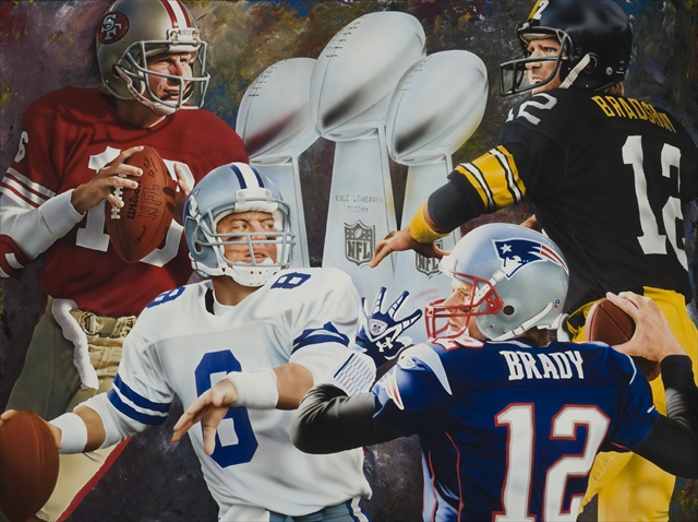 This NFL licensed painting depicts the only four NFL quarterbacks to have three or more Super Bowl wins throughout their career. They are Terry Bradshaw of the Pittsburgh Steelers San Francisco's star Jow Montana of 49er fame Dallas Cowboys Troy Aikman and Tom Brady of the New England Patriots. Giclee prints are museum quality pieces printed using archival ink on archival canvas with the industries most advanced technology. Prints through this process result canvases that are as detailed and richly colored as an original painting. Fade resistant archival inks and fine art grade printing material guarantee a beautifully crafted piece that will endure.