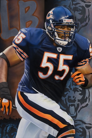 This NFL licensed painting of Chicago linebacker Lance Briggs shows him chasing down a running back. The painting was inspired by the way a bear would chase down its prey in the wild. Giclee prints are museum quality pieces printed using archival ink on archival canvas with the industries most advanced technology. Prints through this process result canvases that are as detailed and richly colored as an original painting. Fade resistant archival inks and fine art grade printing material guarantee a beautifully crafted piece that will endure.