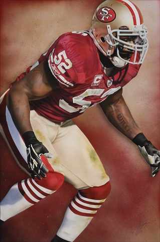 This NFL licensed painting is about San Francisco 49er's linebacker Patrick Willis charging down the line of scrimmage on course to collide with a helpless ball carrier. Giclee prints are museum quality pieces printed using archival ink on archival canvas with the industries most advanced technology. Prints through this process result canvases that are as detailed and richly colored as an original painting. Fade resistant archival inks and fine art grade printing material guarantee a beautifully crafted piece that will endure.