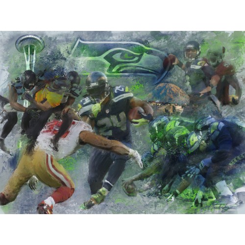 - The Seattle Seahawks are depicted in this painting with the famous Seattle Needle and fierce logo showing a championship team in the State of Washington.