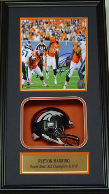 This Shadow Box Brought to You by Encore Select Features Peyton Manning of the Denver Broncos. This Shadow Box Includes an Autographed Matted Photograph a Miniature Football Helmet a Nameplate and a Certificate of Authenticity