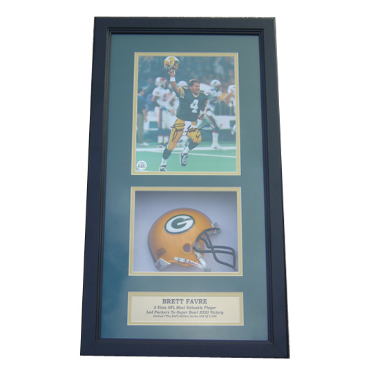 ENCORE SELECT 641-36 BRETT FAVRE GREEN BAY AUTOGRAPHED PHOTOGRAPH WITH AN 8 X 10 IN. PHOTOGRAPH AND MINIATURE HELMET IN A 14 X 20 IN. DELUXE FRAME SHADOW BOX