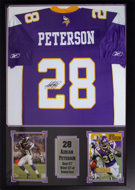 ENCORE SELECT 701-02 ADRIAN PETERSON AUTOGRAPHED MINNESOTA VIKINGS JERSEY WITH TWO 8 X 10 IN. PHOTOGRAPH AND JERSEY IN A 36 X 44 IN. DELUXE CUSTOM FRAME