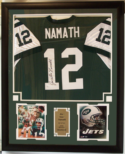 ENCORE SELECT 701-96 JOE NAMATH AUTOGRAPHED NEW YORK JETS HOME JERSEY WITH TWO 8 X 10 IN. PHOTOGRAPH AND JERSEY IN A 36 X 44 IN. DELUXE FRAME SHADOW BOX