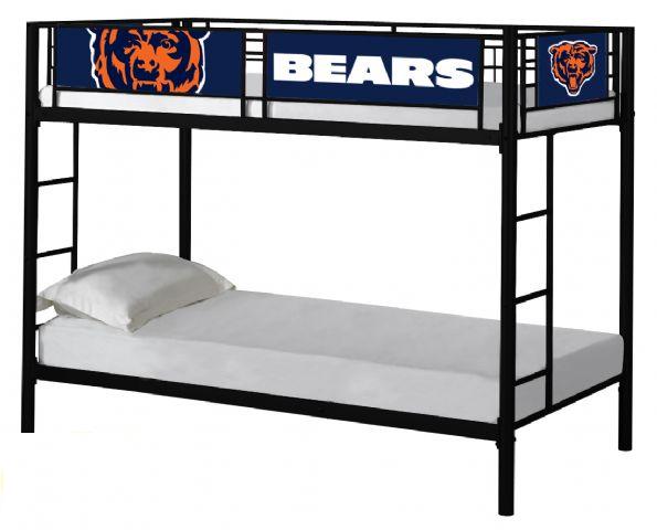 The NFL Chicago Bears Black Metal Bunk Bed with large printed Team Color Graphics!Lower and upper bunks allow for twin size mattresses.