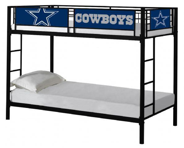 The NFL Dallas Cowboys Black Metal Bunk Bed with large printed Team Color Graphics!Lower and upper bunks allow for twin size mattresses.