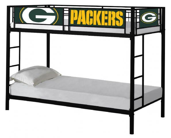 The NFL Green Bay Packers Black Metal Bunk Bed with large printed Team Color Graphics!Lower and upper bunks allow for twin size mattresses.